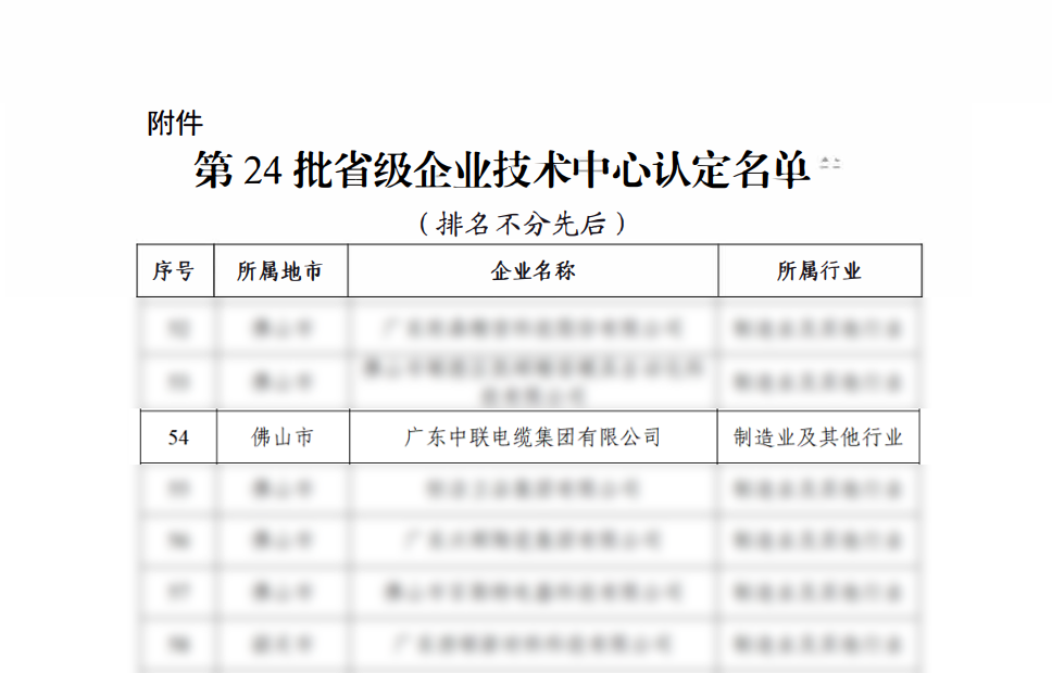 12月2日,广东省工业和信息化厅下发《关于印发第24批广东省企业技术中心认定名单的通知》,广东中联电缆集团有限公司成功“广东省企业技术中心”认定,标志着通广东中联电缆集团已正式进入省级重点支持的技术创新企业行列,在省级技术类资质认定上的又一次跃升。