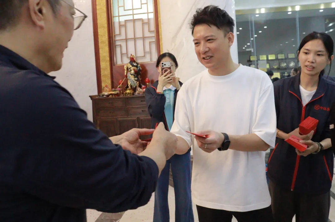 团总裁李智强先生、董事会成员李敏婷女士来到办公楼区域,为这里的同事们派发了精心准备的利事。每一个利事都饱含着集团对员工的关怀与祝福,里面不仅有象征着好运的红包,更装着对大家新一年的殷切期许。员工们接过利事,脸上纷纷洋溢起幸福的笑容,现场气氛热烈而融洽。