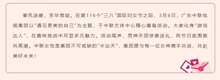 在这个属于所有女性的节日里,广东中联电缆集团以一场充满欢笑与温情的活动,向每一位辛勤耕耘、默默奉献的“中联女神”致以最诚挚的敬意与祝福。“遇见更美的自己”——这不仅是一句口号,更是我们对每一位女性员工的期许:愿你们在职场与生活中,都能以多元的角色、自信的姿态,绽放属于自己的光芒。