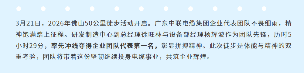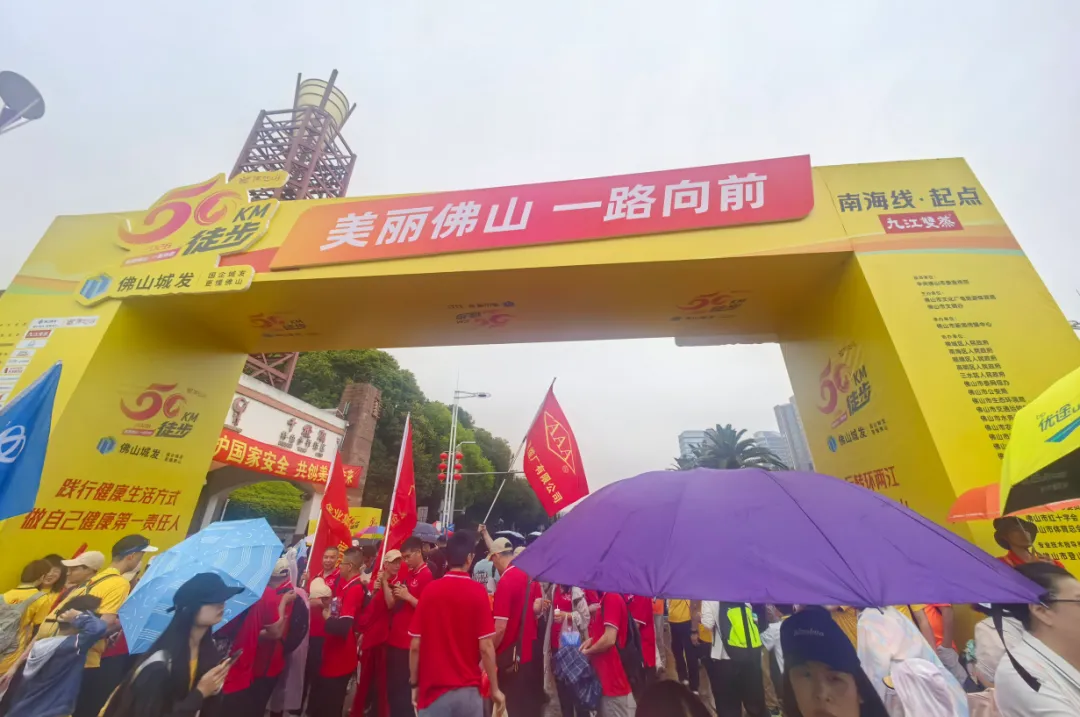 “美丽佛山 一路向前——佛山50公里徒步”活动盛大启幕。8点,晨曦微露,细雨如丝,如轻柔的乐章洒落大地。广东中联电缆集团的企业代表们已齐聚活动起点,他们身着统一服装,精神抖擞,眼神中满是坚定与期待,尽管细雨飘飞,却浇不灭心中那团炽热的火焰。作为企业走在前列的先锋力量,他们肩负着展现企业风采、引领团队奋进的使命。