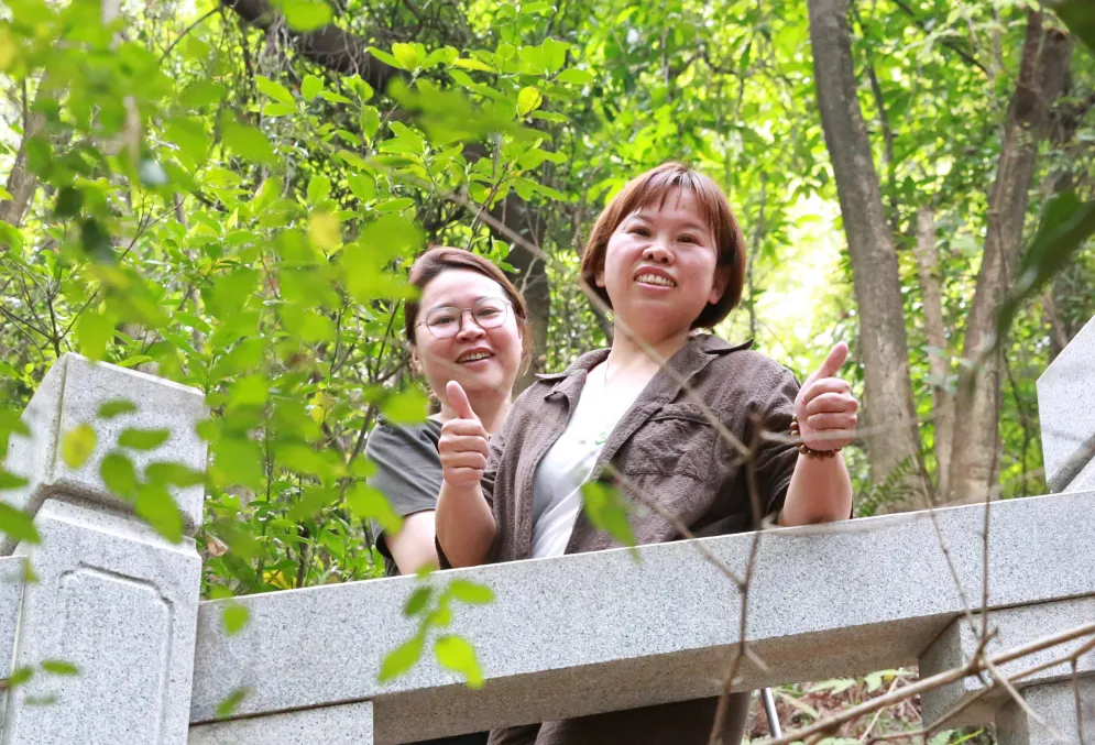 出发时,常务副总经理易守琼因低血糖突发头晕、脸色煞白,团队心瞬间揪紧。大家迅速分工,有人递温水,有人搀扶她到阴凉处稍做休息。稍作调整,易总坚持继续攀登,成员们主动帮忙拿物、搀扶,相互扶持照应,很快在表演处汇合,继续向山顶进发,尽显团队力量与担当。