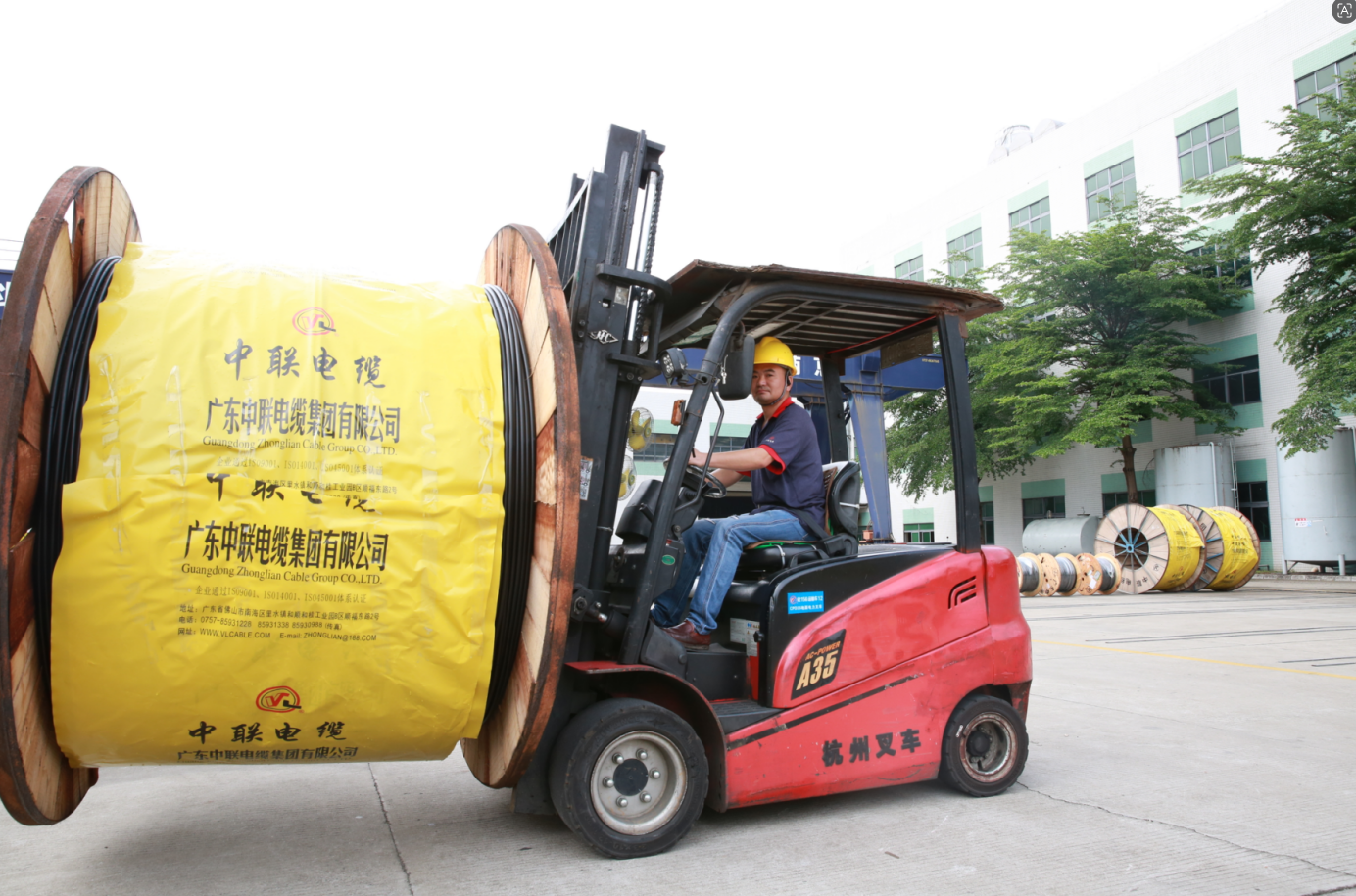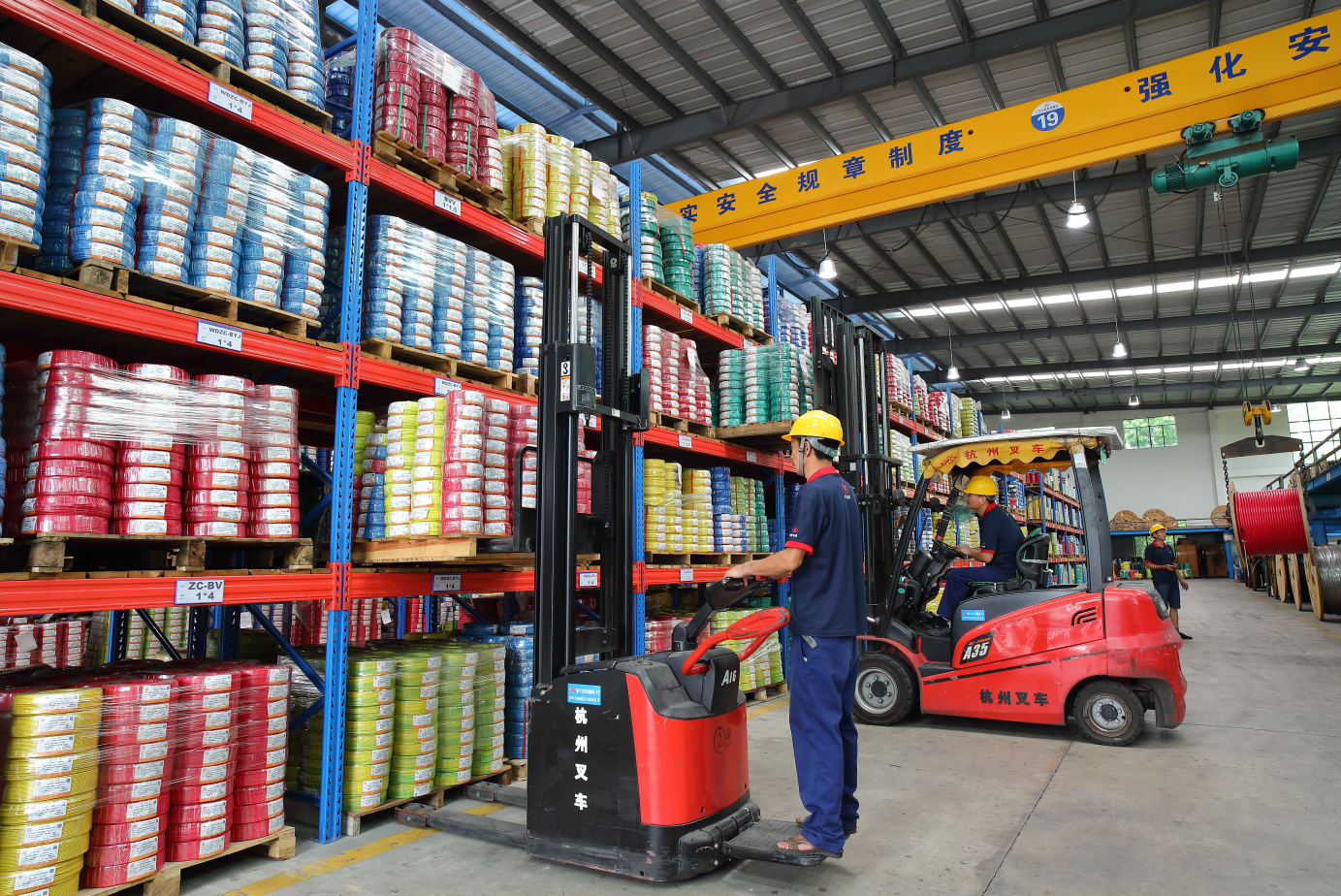 叉车司机熟练地驾驶着叉车,在仓库中穿梭,将打包好的电缆快速准确地装车,为电缆的及时发货提供有力保障。