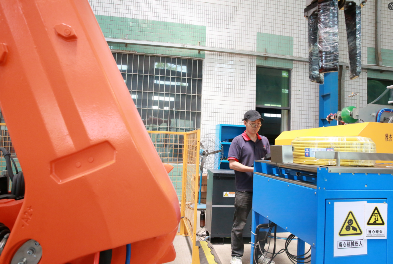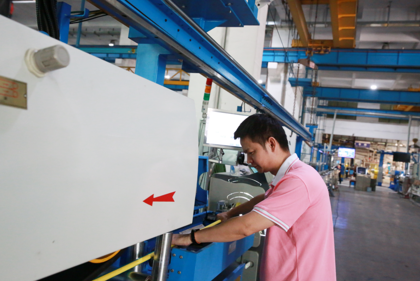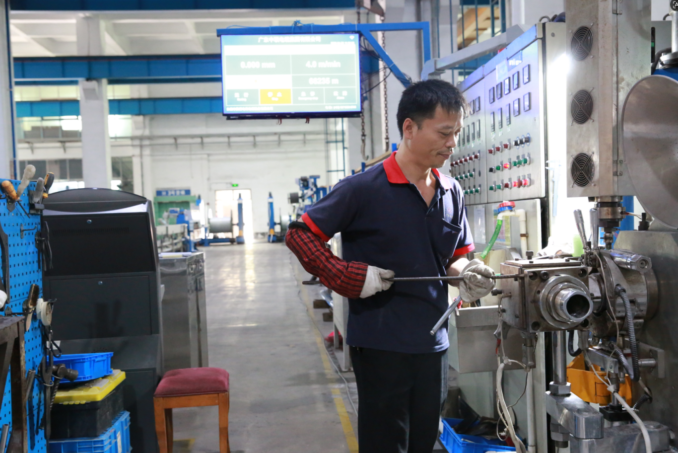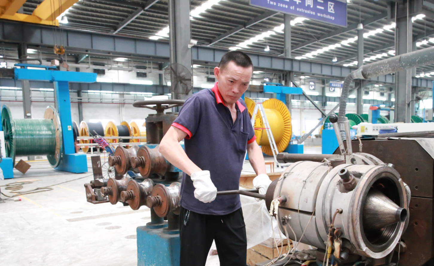 挤塑机长全神贯注,让塑料均匀地包裹在电缆外,为电缆穿上坚固的“外衣”;